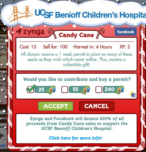 Zynga will donate 100% of all proceeds from Candy Cane sales to support the UCSF Benioff Children's Hospital. Oh, and if you buy a permit, you get a special prize too--one you can share!